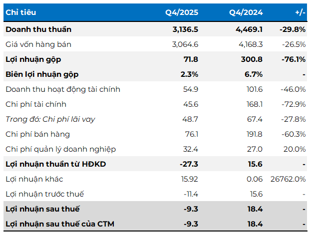 Sau khi trừ chi phí, Công ty lỗ ròng hơn 9 tỷ đồng trong quý 4/2025, trong khi cùng kỳ lãi 18 tỷ đồng.