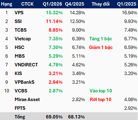 Sau những biến động, tổng thị phần của 10 công ty dẫn đầu đạt 69.05% toàn HOSE, cao hơn con số 68.13% của quý 4/2025.
