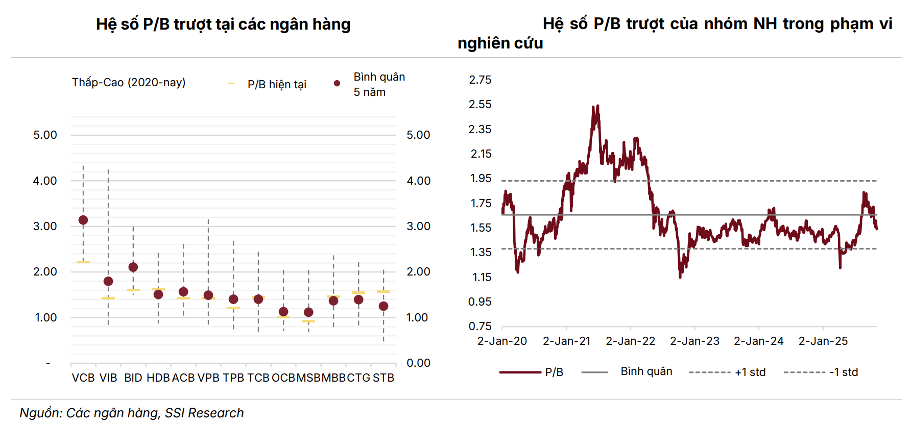 Sau khi đạt đỉnh vào tháng 8/2025, Chứng khoán SSI cho biết hệ số P/B trượt trung bình của nhóm được theo dõi đã giảm 16.4% xuống 1.53x, thấp hơn mức trung bình 5 năm (1.65x). P/B dự phóng 2026 chỉ còn 1.28x, trong khi lợi nhuận dự kiến tăng 18%.