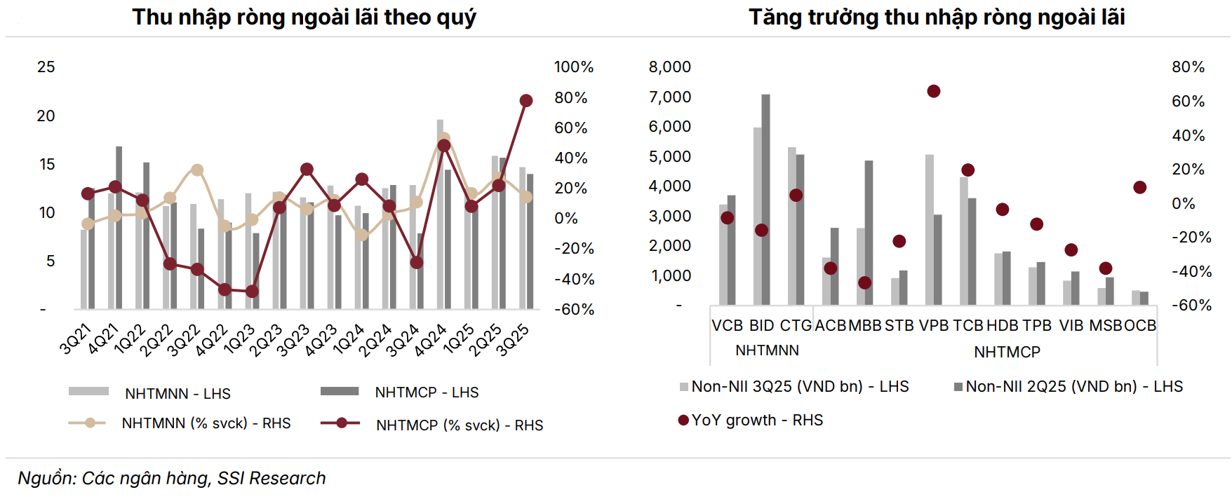 Theo SSI Research, thu nhập từ chứng khoán kinh doanh và đầu tư của các ngân hàng trong quý 3/2025 tăng tới 33 lần so với cùng kỳ, đóng góp vào tăng trưởng thu nhập ngoài lãi toàn ngành. Qua đó, cho thấy thị trường chứng khoán đã trở thành nguồn lợi nhuận bổ sung cực kỳ quan trọng.