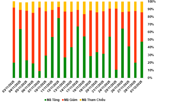Kết thúc phiên giao dịch ngày 01/12/2025, toàn thị trường có 136 mã tăng, 116 mã giảm và 36 mã tham chiếu.