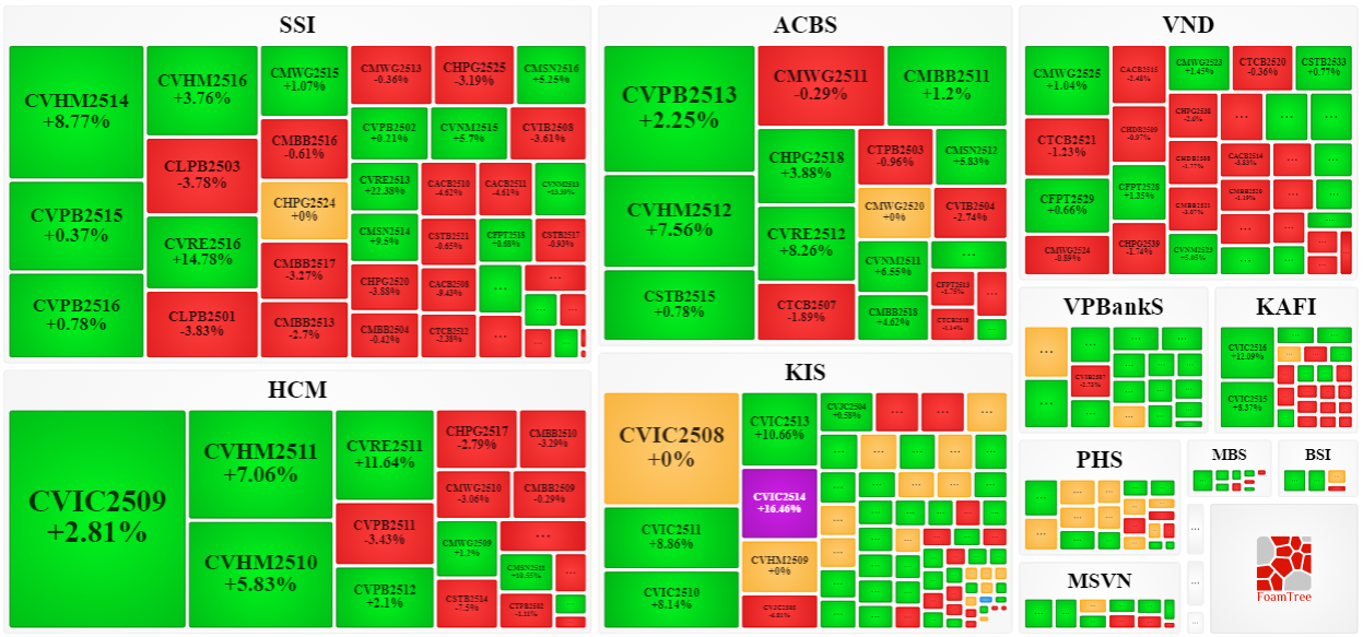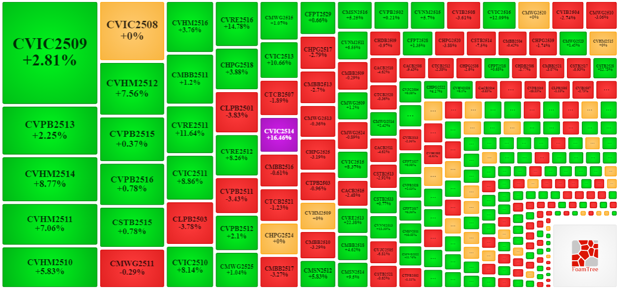 Trong phiên giao dịch ngày 01/12/2025, thị trường diễn biến phân hóa nhưng bên mua có phần chiếm ưu thế hơn khiến phần lớn các mã chứng quyền tăng giá. Cụ thể, các mã chứng quyền lớn trong nhóm tăng giá là CVIC2509, CVPB2513, CVHM2514 và CVHM2511.