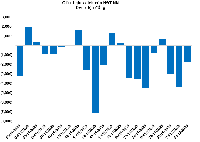 Kết thúc phiên giao dịch ngày 01/12/2025, toàn thị trường có 136 mã tăng, 116 mã giảm và 36 mã tham chiếu. Khối ngoại tiếp tục bán ròng với tổng mức bán ròng đạt 1.73 tỷ đồng.