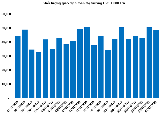 Khối lượng giao dịch toàn thị trường trong phiên 01/12 đạt 48.71 triệu CW, giảm 3.71%; giá trị giao dịch đạt 74.9 tỷ đồng, giảm 15.95% so với phiên 28/11. Trong đó, CHPG2535 là mã dẫn đầu thị trường về khối lượng và giá trị giao dịch, với tổng khối lượng đạt 5 triệu CW, tương đương giá trị 3.73 tỷ đồng.