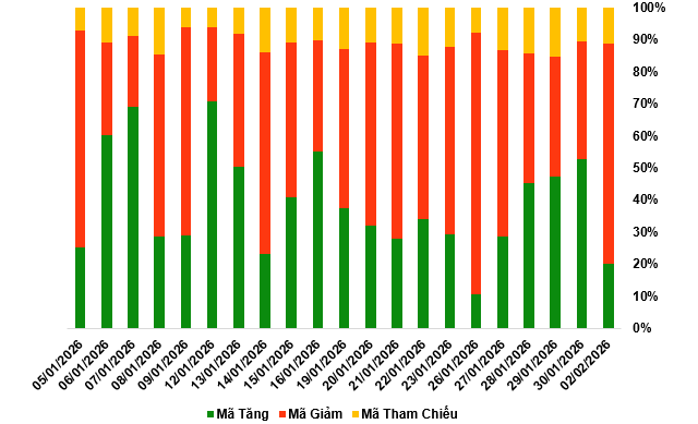 Kết thúc phiên giao dịch ngày 02/02/2026, toàn thị trường có 64 mã tăng, 218 mã giảm và 36 mã tham chiếu.