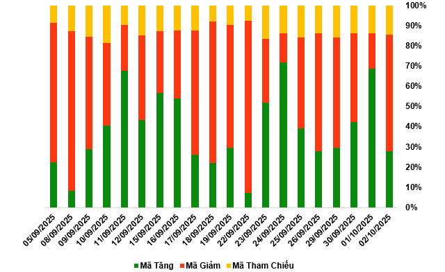 Kết thúc phiên giao dịch ngày 02/10/2025, toàn thị trường có 79 mã tăng, 163 mã giảm và 41 mã tham chiếu.