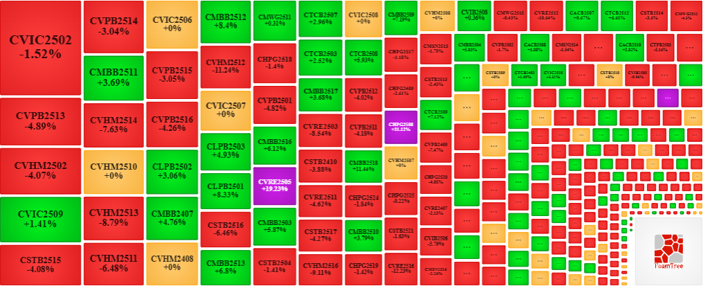 Trong phiên giao dịch ngày 02/10/2025, bên bán quay lại dẫn dắt thị trường khiến phần lớn các mã chứng quyền giảm giá. Cụ thể, các mã chứng quyền lớn trong nhóm giảm giá là CVIC2502, CVHM2502, CHPG2518 và CVPB2513.
