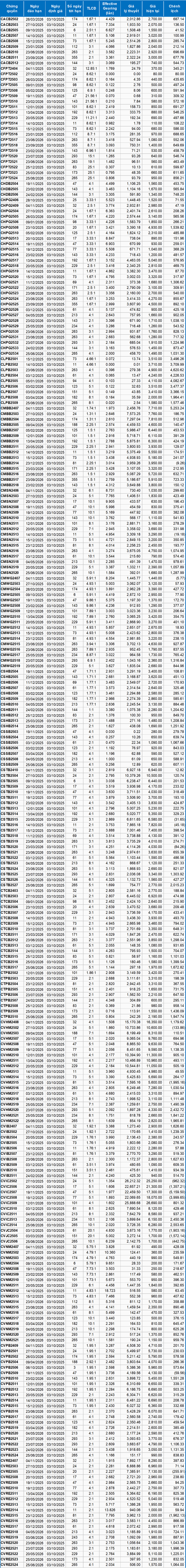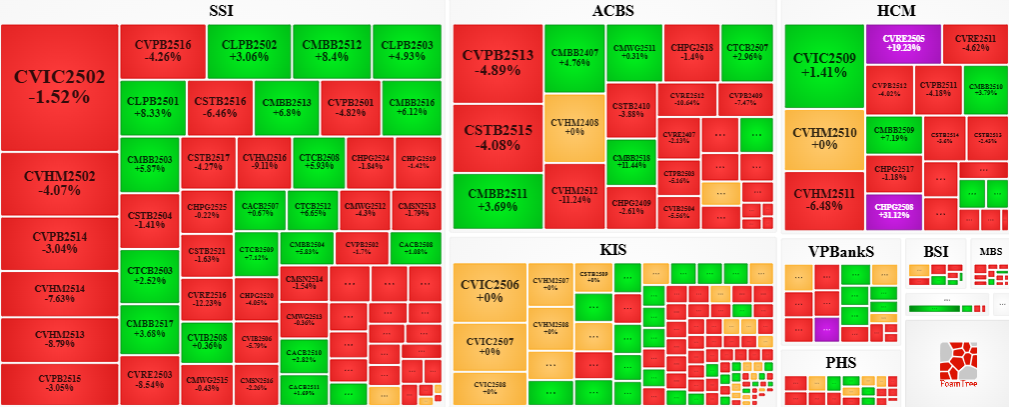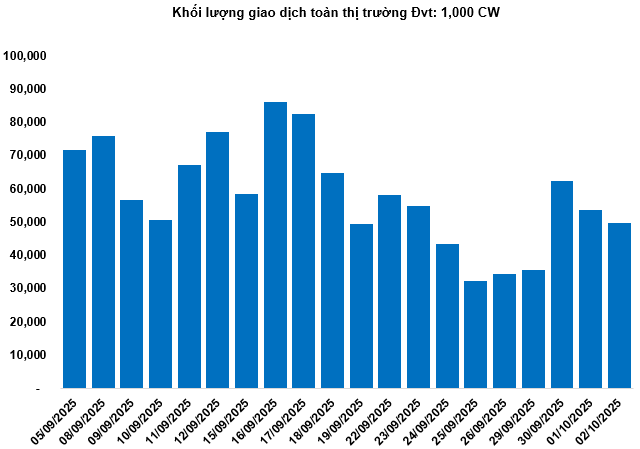 Khối lượng giao dịch toàn thị trường trong phiên 02/10 đạt 49.69 triệu CW, giảm 7.05%; giá trị giao dịch đạt 127.55 tỷ đồng, giảm 11.51% so với phiên 01/10. Trong đó, CHPG2533 là mã dẫn đầu thị trường về khối lượng với 2.54 triệu CW; CSTB2515 dẫn đầu về giá trị giao dịch với 10.47 tỷ đồng.