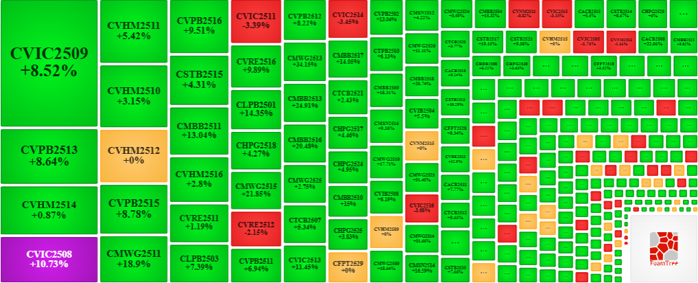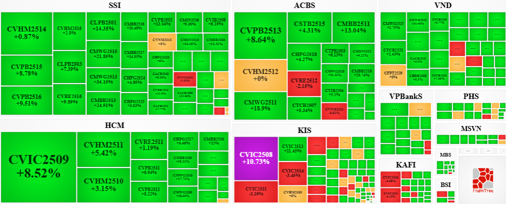 Trong phiên giao dịch ngày 03/12/2025, bên mua quay lại áp đảo thị trường khiến phần lớn các mã chứng quyền tăng giá. Cụ thể, các mã chứng quyền lớn trong nhóm tăng giá là CVIC2509, CVPB2513, CVHM2514 và CMWG2511.