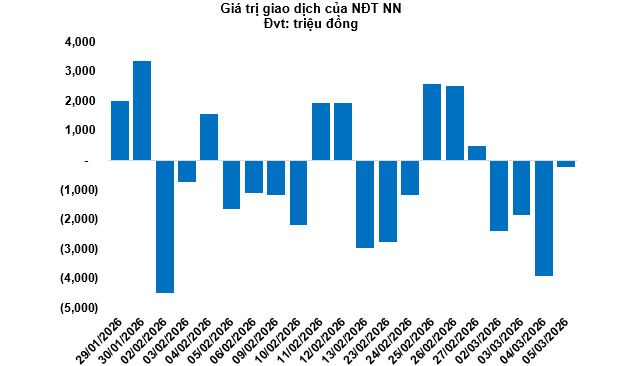 Kết thúc phiên giao dịch ngày 05/03/2026, toàn thị trường có 120 mã tăng, 147 mã giảm và 44 mã tham chiếu. Khối ngoại tiếp tục bán ròng với tổng mức bán ròng đạt 228.61 triệu đồng.