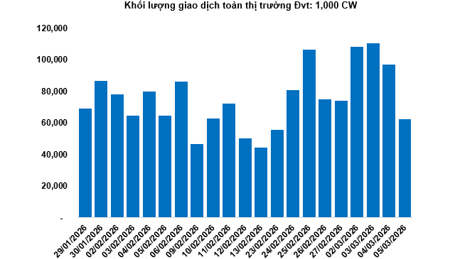 Khối lượng giao dịch toàn thị trường trong phiên 05/03 đạt 62.53 triệu CW, giảm 35.61%; giá trị giao dịch đạt 92.33 tỷ đồng, giảm 32.52% so với phiên 04/03. Trong đó, CACB2606 là mã dẫn đầu thị trường về khối lượng với 5.46 triệu CW; CSTB2521 dẫn đầu về giá trị giao dịch với 6.21 tỷ đồng.