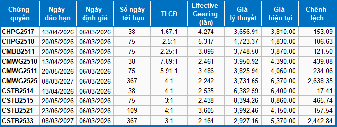 Thị trường chứng quyền ngày 06/03/2026: Thị trường diễn biến phân hóa