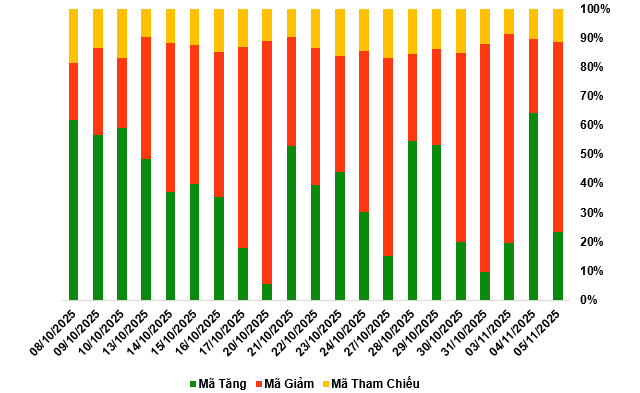 Kết thúc phiên giao dịch ngày 05/11/2025, toàn thị trường có 64 mã tăng, 178 mã giảm và 31 mã tham chiếu.