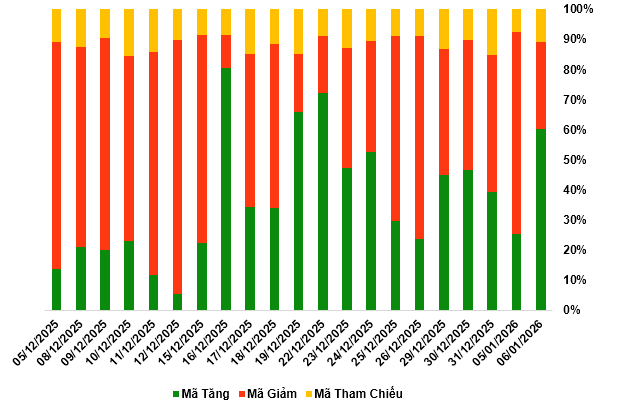 Kết thúc phiên giao dịch ngày 06/01/2026, toàn thị trường có 155 mã tăng, 77 mã giảm và 26 mã tham chiếu.