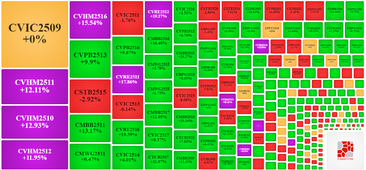 Trong phiên giao dịch ngày 06/01/2026, bên mua quay lại dẫn dắt thị trường khiến phần lớn các mã chứng quyền tăng giá. Cụ thể, các mã chứng quyền lớn trong nhóm tăng giá là CVHM2511, CVPB2513, CMBB2511 và CMWG2511.