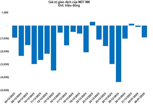 Kết thúc phiên giao dịch ngày 06/01/2026, toàn thị trường có 155 mã tăng, 77 mã giảm và 26 mã tham chiếu. Khối ngoại tiếp tục bán ròng với tổng mức bán ròng đạt 921.44 triệu đồng.