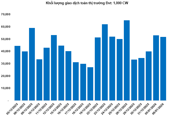 Khối lượng giao dịch toàn thị trường trong phiên 06/01 đạt 51.79 triệu CW, giảm 2.39%; giá trị giao dịch đạt 101.42 tỷ đồng, giảm 2.67% so với phiên 05/01. Trong đó, CHPG2535 là mã dẫn đầu thị trường về khối lượng với 3.32 triệu CW; CMBB2518 dẫn đầu về giá trị giao dịch với 7.26 tỷ đồng.