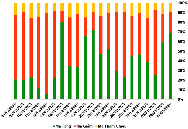 Kết thúc phiên giao dịch ngày 07/01/2026, toàn thị trường có 178 mã tăng, 59 mã giảm và 21 mã tham chiếu.