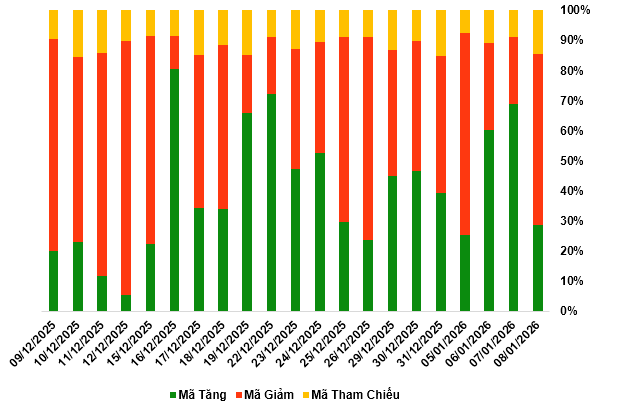 Kết thúc phiên giao dịch ngày 08/01/2026, toàn thị trường có 73 mã tăng, 146 mã giảm và 36 mã tham chiếu.
