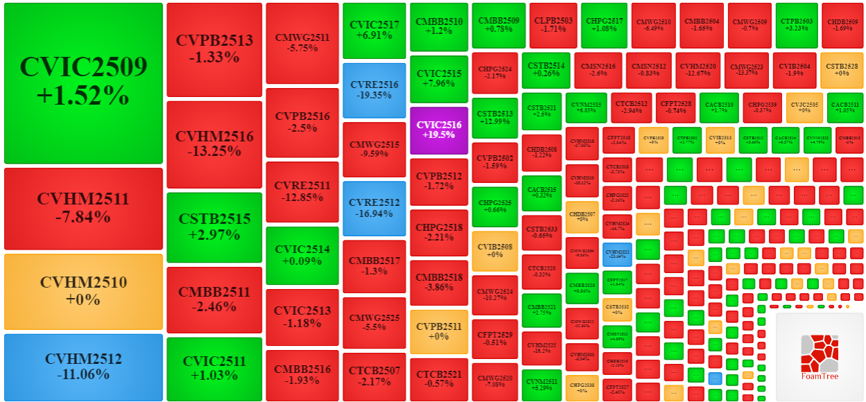 Khối lượng giao dịch toàn thị trường trong phiên 08/01 đạt 59.79 triệu CW, giảm 4.35%; giá trị giao dịch đạt 134.34 tỷ đồng, tăng 14.92% so với phiên 07/01. Trong đó, CTCB2518 là mã dẫn đầu thị trường về khối lượng với 2.97 triệu CW; CVIC2511 dẫn đầu về giá trị giao dịch với 11.27 tỷ đồng.