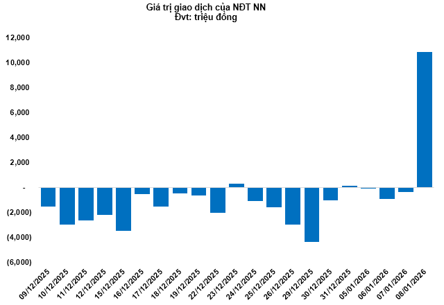 Kết thúc phiên giao dịch ngày 08/01/2026, toàn thị trường có 73 mã tăng, 146 mã giảm và 36 mã tham chiếu. Khối ngoại quay lại mua ròng với tổng mức mua ròng đạt 10.9 tỷ đồng.