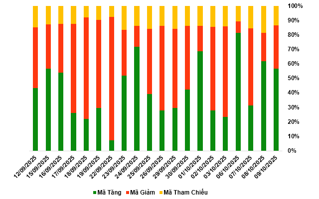 Kết thúc phiên giao dịch ngày 09/10/2025, toàn thị trường có 158 mã tăng, 84 mã giảm và 36 mã tham chiếu.