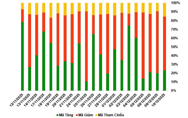 Kết thúc phiên giao dịch ngày 10/12/2025, toàn thị trường có 62 mã tăng, 168 mã giảm và 41 mã tham chiếu.
