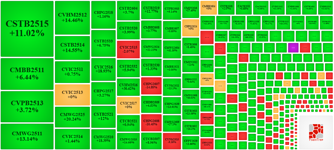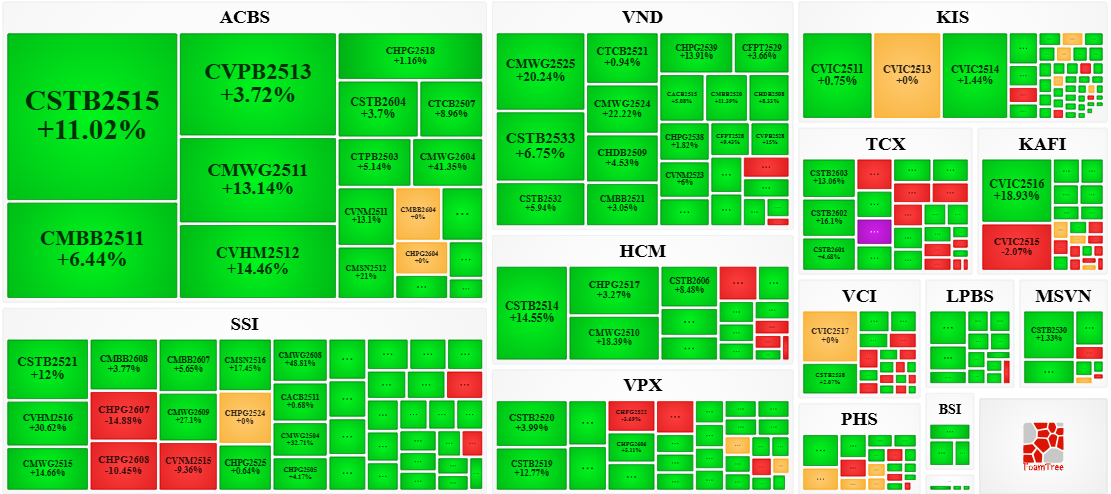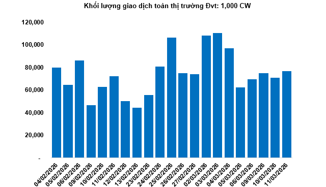 Khối lượng giao dịch toàn thị trường trong phiên 11/03 đạt 76.66 triệu CW, tăng 7.76%; giá trị giao dịch đạt 107.97 tỷ đồng, tăng 33.65% so với phiên 10/03. Trong đó, CVNM2515 là mã dẫn đầu thị trường về khối lượng với 2.37 triệu CW; CSTB2521 dẫn đầu về giá trị giao dịch với 9.02 tỷ đồng.