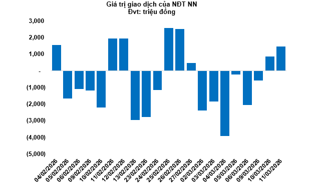 Kết thúc phiên giao dịch ngày 11/03/2026, toàn thị trường có 215 mã tăng, 64 mã giảm và 24 mã tham chiếu. Khối ngoại tiếp tục mua ròng với tổng mức mua ròng đạt 1.46 tỷ đồng.