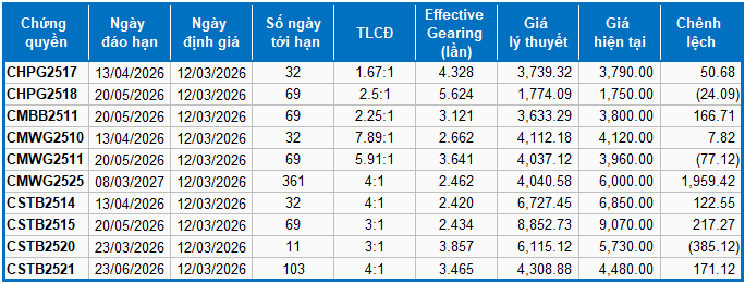 Dựa trên phương pháp định giá phù hợp với thời điểm khởi đầu là ngày 12/03/2026, mức giá hợp lý của 10 chứng quyền có vốn hóa lớn nhất và thanh khoản (giá trị và khối lượng khớp lệnh) vượt trội trong phiên được thể hiện như sau: