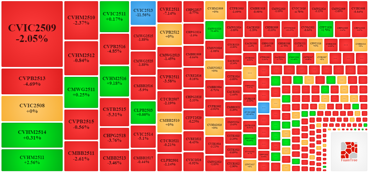 Trong phiên giao dịch ngày 11/12/2025, bên bán tiếp tục dẫn dắt thị trường khiến phần lớn các mã chứng quyền giảm giá. Cụ thể, các mã chứng quyền lớn trong nhóm giảm giá là CVIC2509, CVPB2513, CVHM2510 và CVPB2515.