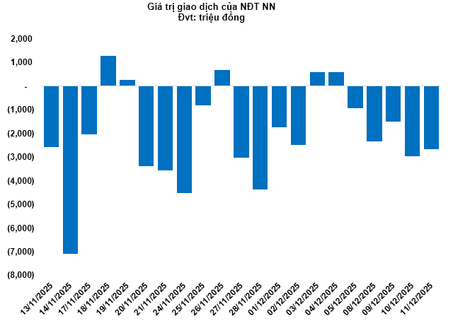 Kết thúc phiên giao dịch ngày 11/12/2025, toàn thị trường có 32 mã tăng, 202 mã giảm và 37 mã tham chiếu. Khối ngoại tiếp tục bán ròng với tổng mức bán ròng đạt 2.66 tỷ đồng.