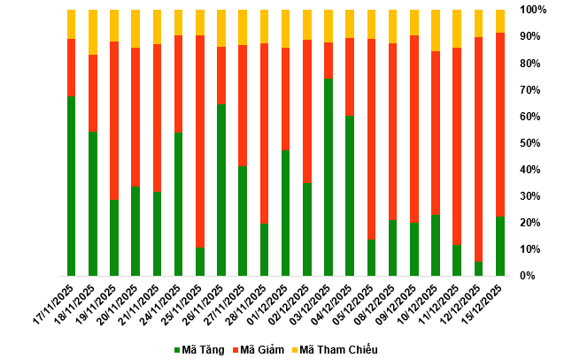 Kết thúc phiên giao dịch ngày 15/12/2025, toàn thị trường có 57 mã tăng, 178 mã giảm và 22 mã tham chiếu.