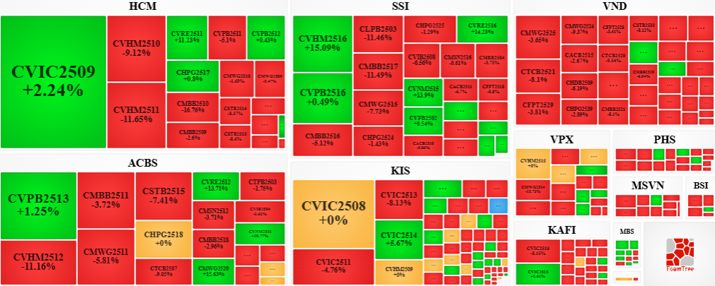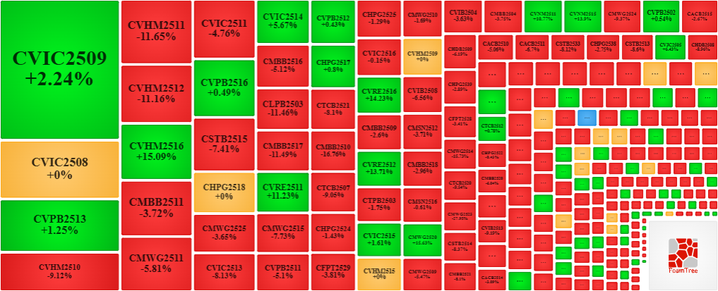 Trong phiên giao dịch ngày 15/12/2025, bên bán tiếp tục dẫn dắt thị trường khiến phần lớn các mã chứng quyền giảm giá. Cụ thể, các mã chứng quyền lớn trong nhóm giảm giá là CVHM2511, CVIC2511, CMBB2511 và CMWG2511.