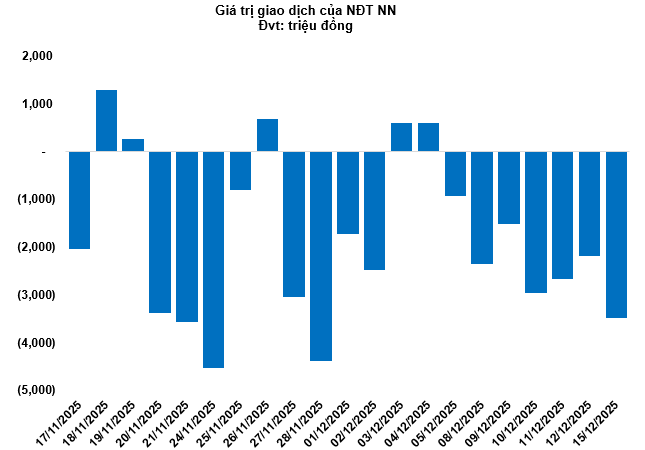 Kết thúc phiên giao dịch ngày 15/12/2025, toàn thị trường có 57 mã tăng, 178 mã giảm và 22 mã tham chiếu. Khối ngoại tiếp tục bán ròng với tổng mức bán ròng đạt 3.48 tỷ đồng.