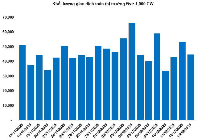 Khối lượng giao dịch toàn thị trường trong phiên 15/12 đạt 44.62 triệu CW, giảm 16.32%; giá trị giao dịch đạt 68.92 tỷ đồng, giảm 35.18% so với phiên 12/12. Trong đó, CSTB2528 là mã dẫn đầu thị trường về khối lượng và giá trị giao dịch, với tổng khối lượng đạt 6.69 triệu CW, tương đương giá trị 5.99 tỷ đồng.