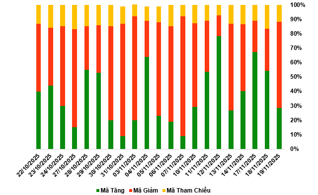 Kết thúc phiên giao dịch ngày 19/11/2025, toàn thị trường có 82 mã tăng, 172 mã giảm và 34 mã tham chiếu.