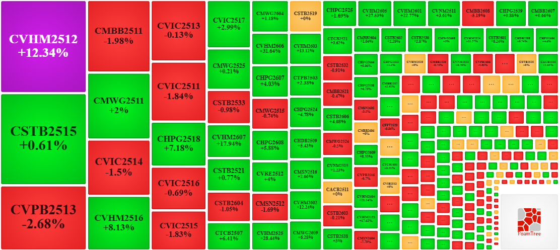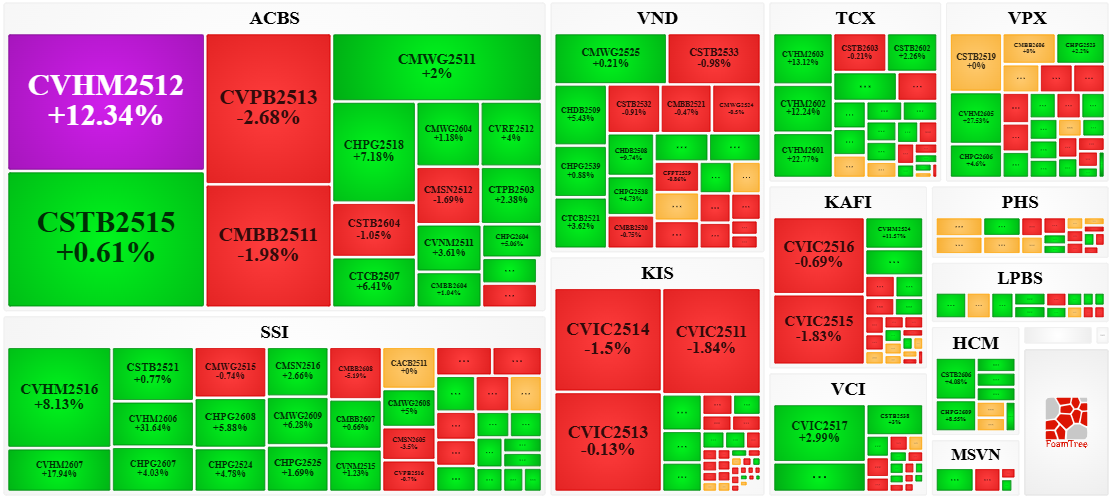 Trong phiên giao dịch ngày 20/04/2026, thị trường diễn biến phân hóa nhưng bên mua có phần lấn lướt hơn khiến phần lớn các mã chứng quyền tăng giá. Cụ thể, các mã chứng quyền lớn trong nhóm tăng giá là CVHM2512, CSTB2515, CMWG2511 và CVHM2516.