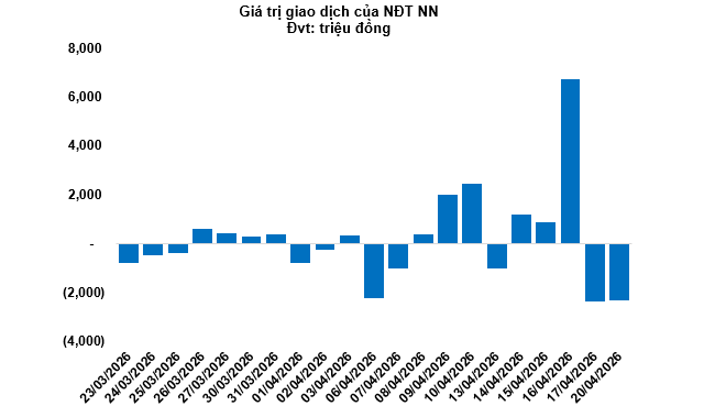 Kết thúc phiên giao dịch ngày 20/04/2026, toàn thị trường có 120 mã tăng, 105 mã giảm và 41 mã tham chiếu. Khối ngoại tiếp tục bán ròng với tổng mức bán ròng đạt 2.34 tỷ đồng.