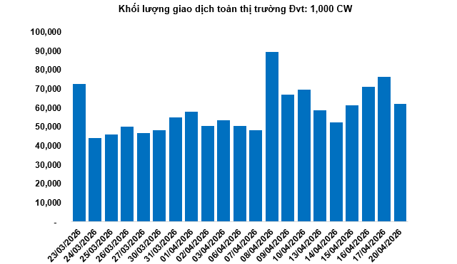 Khối lượng giao dịch toàn thị trường trong phiên 20/04 đạt 62.09 triệu CW, giảm 18.8%; giá trị giao dịch đạt 94.14 tỷ đồng, giảm 16.5% so với phiên 17/04. Trong đó, CMBB2607 là mã dẫn đầu thị trường về khối lượng với 2.99 triệu CW; CSTB2533 dẫn đầu về giá trị giao dịch với 5.89 tỷ đồng.