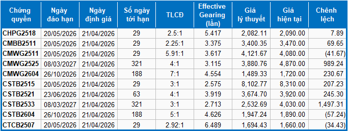 Thị trường chứng quyền ngày 21/04/2026: Thị trường tiếp tục phân hóa