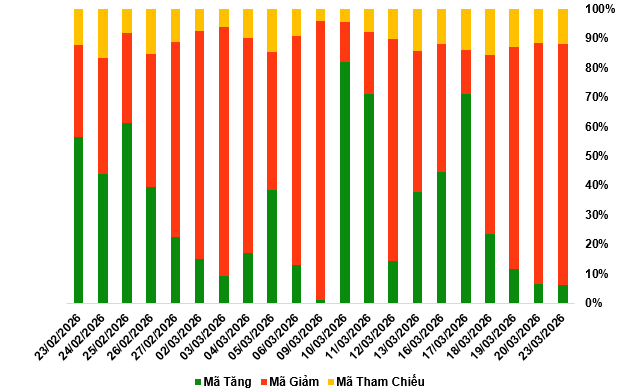 Kết thúc phiên giao dịch ngày 23/03/2026, toàn thị trường có 19 mã tăng, 254 mã giảm và 26 mã tham chiếu.