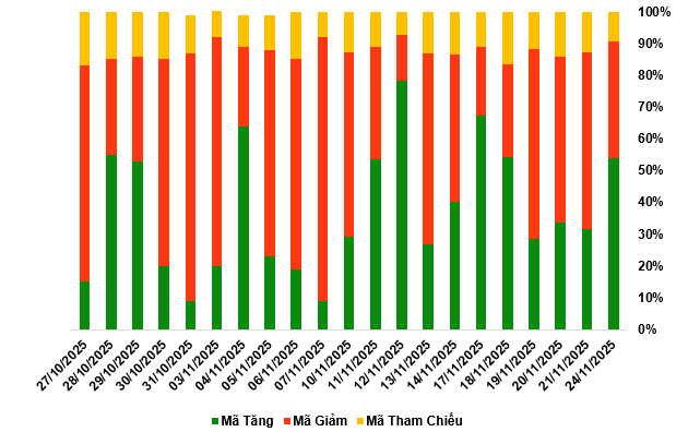 Kết thúc phiên giao dịch ngày 24/11/2025, toàn thị trường có 155 mã tăng, 107 mã giảm và 26 mã tham chiếu.