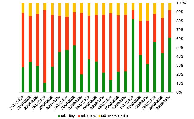 Kết thúc phiên giao dịch ngày 25/02/2026, toàn thị trường có 193 mã tăng, 96 mã giảm và 26 mã tham chiếu.