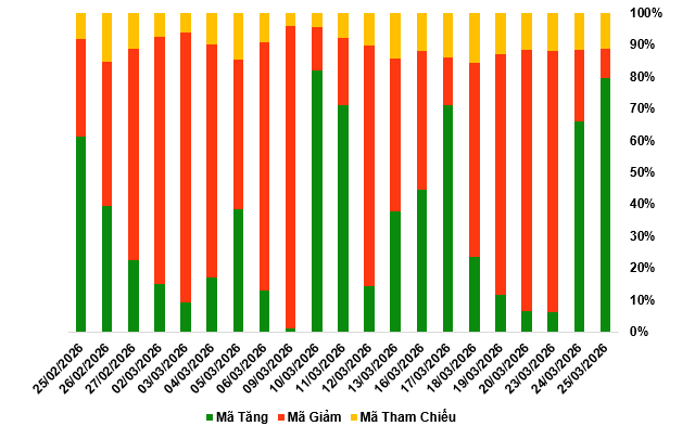 Kết thúc phiên giao dịch ngày 25/03/2026, toàn thị trường có 224 mã tăng, 27 mã giảm và 31 mã tham chiếu.