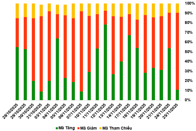 Kết thúc phiên giao dịch ngày 25/11/2025, toàn thị trường có 31 mã tăng, 231 mã giảm và 26 mã tham chiếu.
