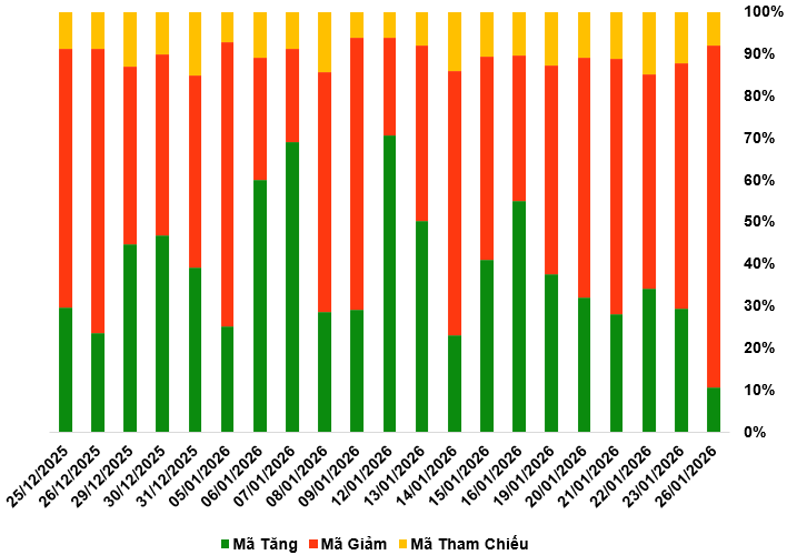Kết thúc phiên giao dịch ngày 26/01/2026, toàn thị trường có 34 mã tăng, 263 mã giảm và 26 mã tham chiếu.