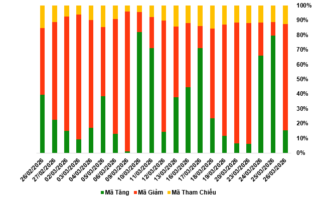 Kết thúc phiên giao dịch ngày 26/03/2026, toàn thị trường có 43 mã tăng, 204 mã giảm và 35 mã tham chiếu.