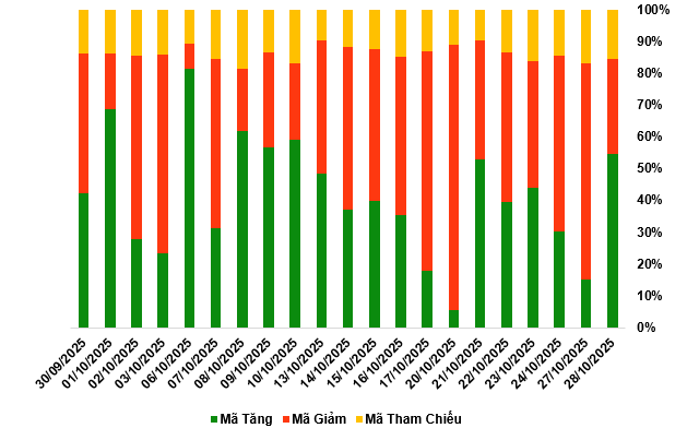 Kết thúc phiên giao dịch ngày 28/10/2025, toàn thị trường có 138 mã tăng, 76 mã giảm và 39 mã tham chiếu.
