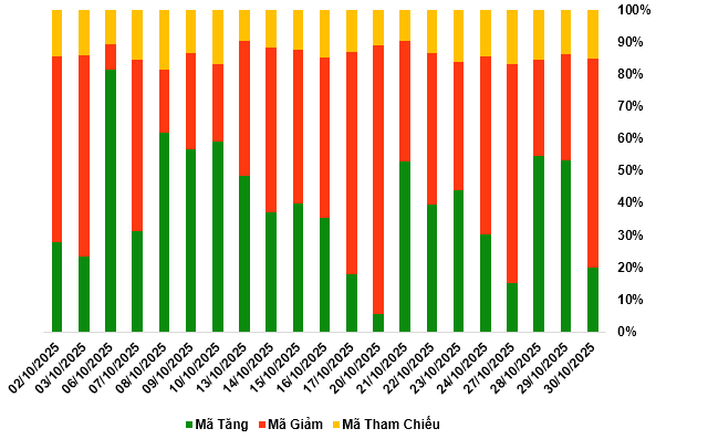 Kết thúc phiên giao dịch ngày 30/10/2025, toàn thị trường có 50 mã tăng, 165 mã giảm và 38 mã tham chiếu.